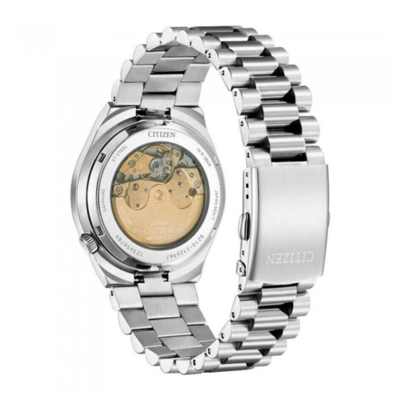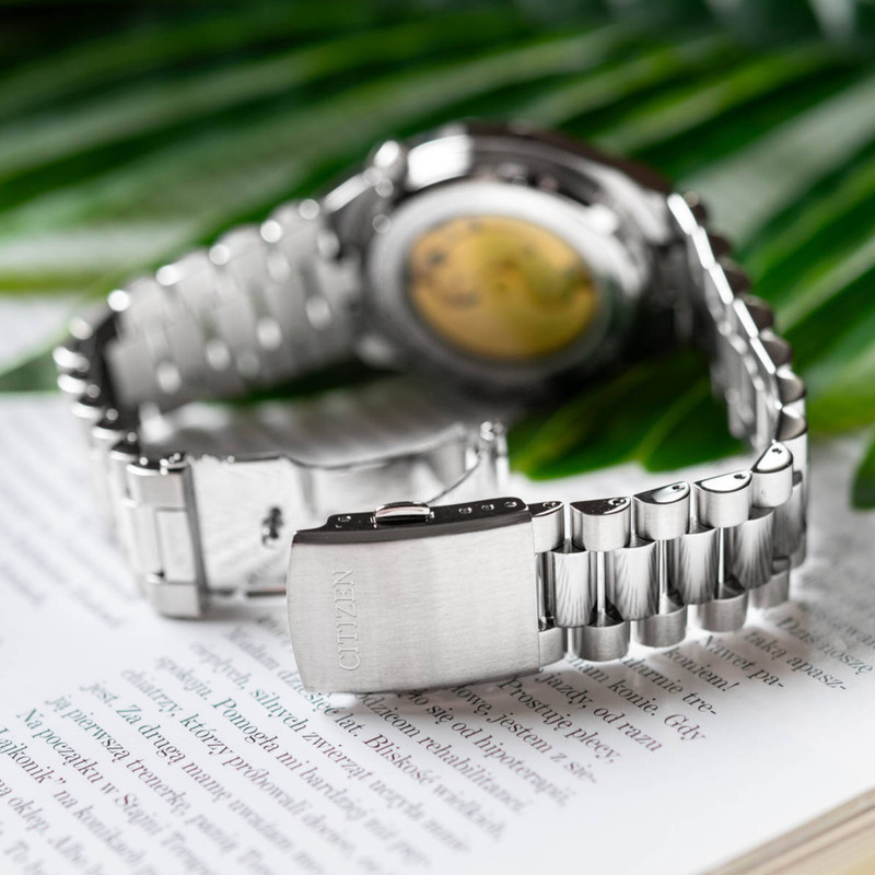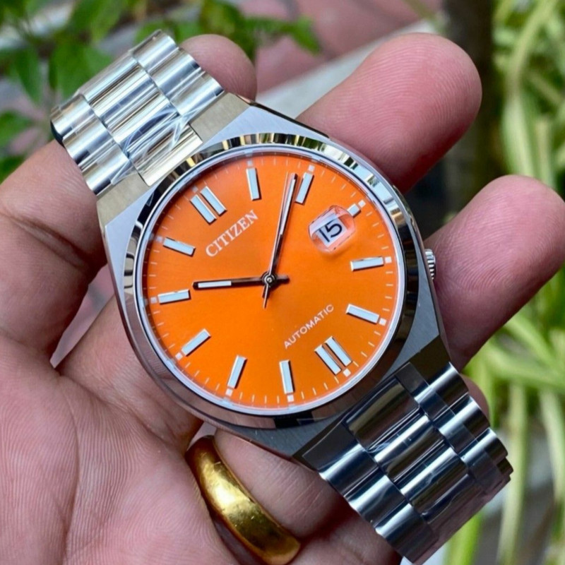 ساعت مچی مردانه اتوماتیک از برند پر آوازه سیتیزن ژاپن که در چند سال اخیر با رونمایی از سری سایوسا توانست نظر همه علاقه مندان به ساعت را جلب کند.حال این کمپانی از رنگ جدیدی از این سری رونمایی کرده است که بسیار پر سروصدا بوده.نکته اول راجع به این ساعت، کیفیت رنگ صفحه بسیار بالایی است که سیتیزن از آن استفاده میکند و وقتی در دستان شما قرار میگیرد ، کسی نیست که به دستانتان خیره نشود.نکته دوم درباره کیفیت ساخت و توانایی های فنی این ساعت میباشد که تا دندان مسلح است.موومنت اتوماتیک تاریخدار در کنار مقاومت در برابر آب تا عمق 100 متر و شیشه ضد خش از جنس یاقوت کبود و عقربه های شب تاب( با فناوری جدید) همگی درون این ساعت قرار گرفته اند.