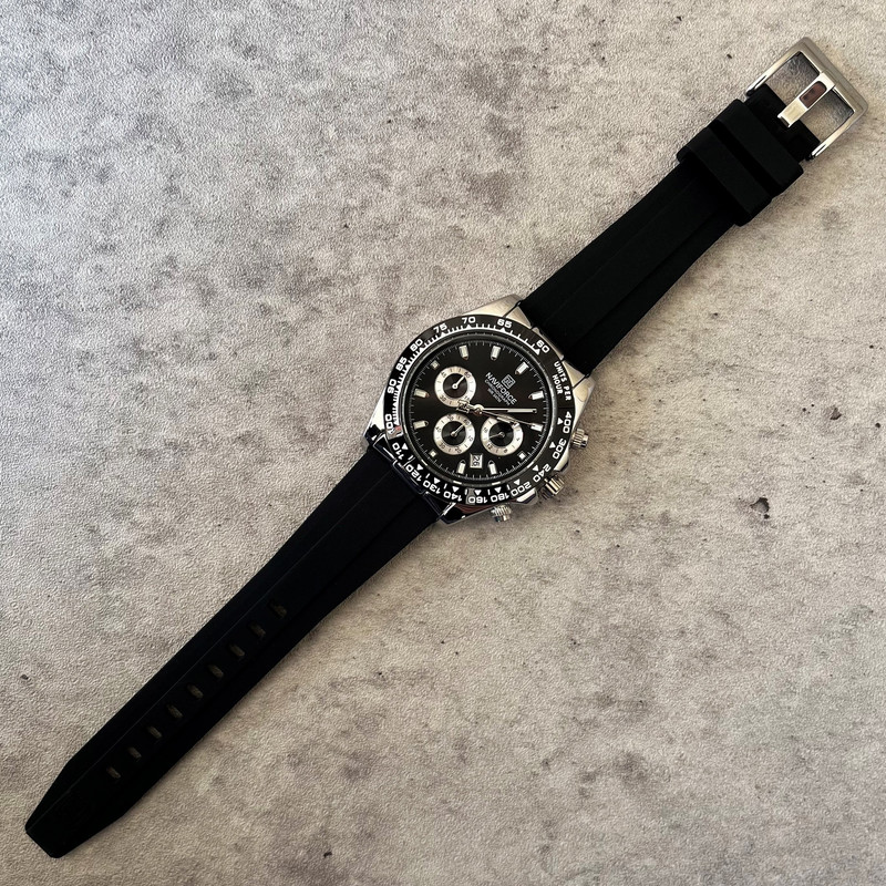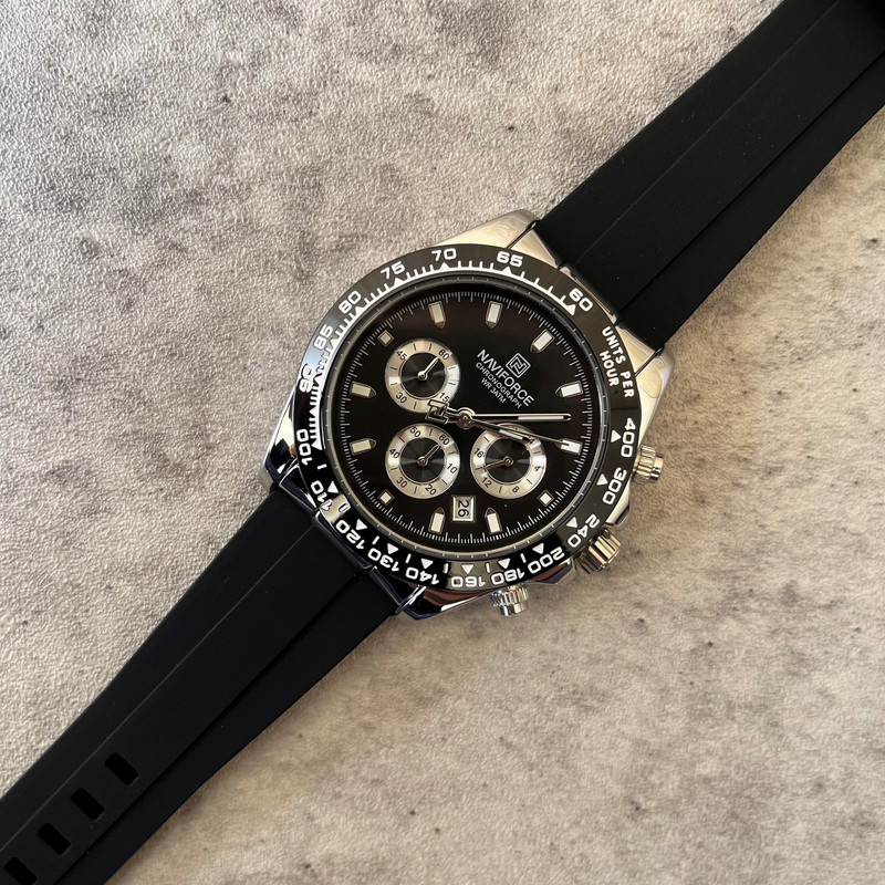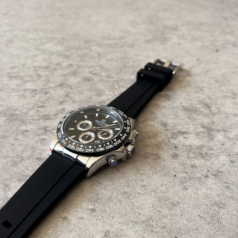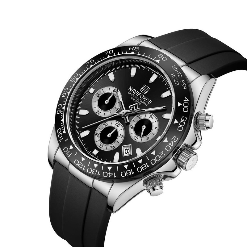این مدل از ساعت مچی های مردانه برند نیوی فورس بر اساس سبک اسپرت و روزمره بوده و دارای طراحی بسیار زیبایی می باشد.شیشه ی معدنی ضد خش و بند رابر بسیار باکیفیت و بدنه ی این ساعت استیل رنگ ثابت بوده که از رنگهای مشکی و نقره ای در آن استفاده شده است و جزو ساعت های خوش فروش برند نیوی فورس است و جزو بهترین و مناسب ترین ایده ها برای کادوی مردانه در مناسبت های مختلف میباشد. طراحی متفاوت این ساعت چشم هر بیننده ای را مینوازد.همچنین این ساعت سه موتوره کرنوگراف بوده و عقربه های کوچک آن کرنومتر است و دارای نمایشگر روزهای ماه و وضعیت 24ساعته و عقره های شب تاب نیز میباشد. و دارای 30متر مقاومت در برابر آب است. همچنین روی قفل و روی سرکوک ساعت و روی عقربه ی ثانیه شمار و صفحه ی ساعت و پشت درب برند نیوی فورس حک شده است. و همانطور که مشاهده میکنید دارای هولوگرام پشت درب و دفترچه نیز میباشد. این ساعت مردانه نیوی فورس در جعبه ای باکیفیت و شیک و کادویی خدمت شما ارسال میگردد.