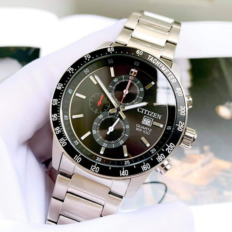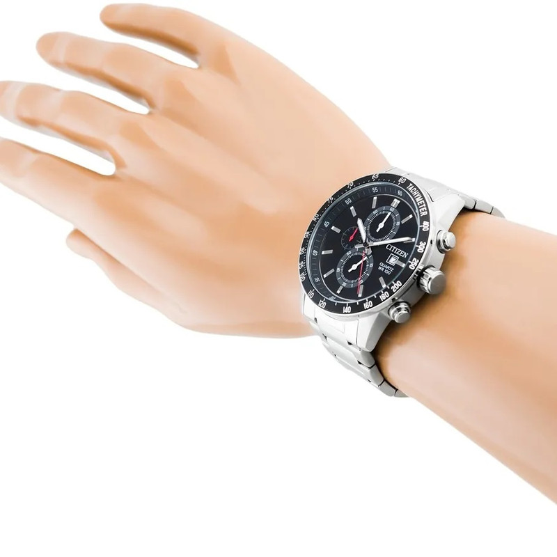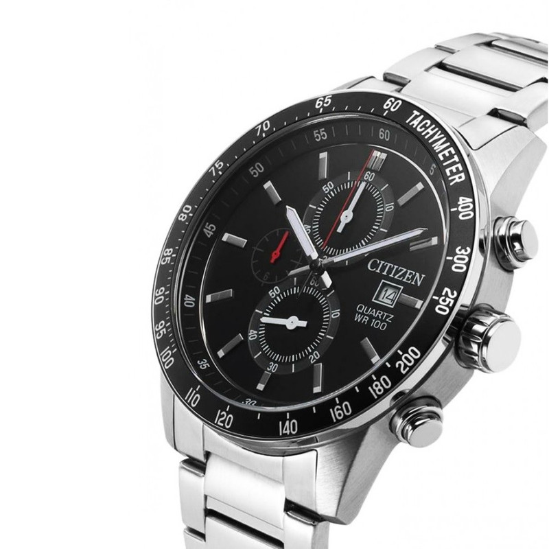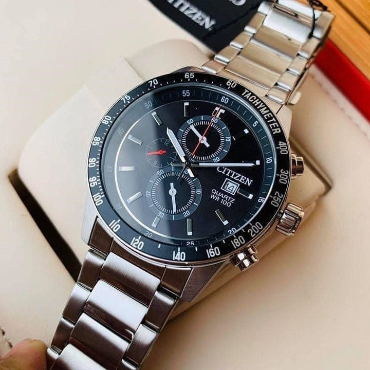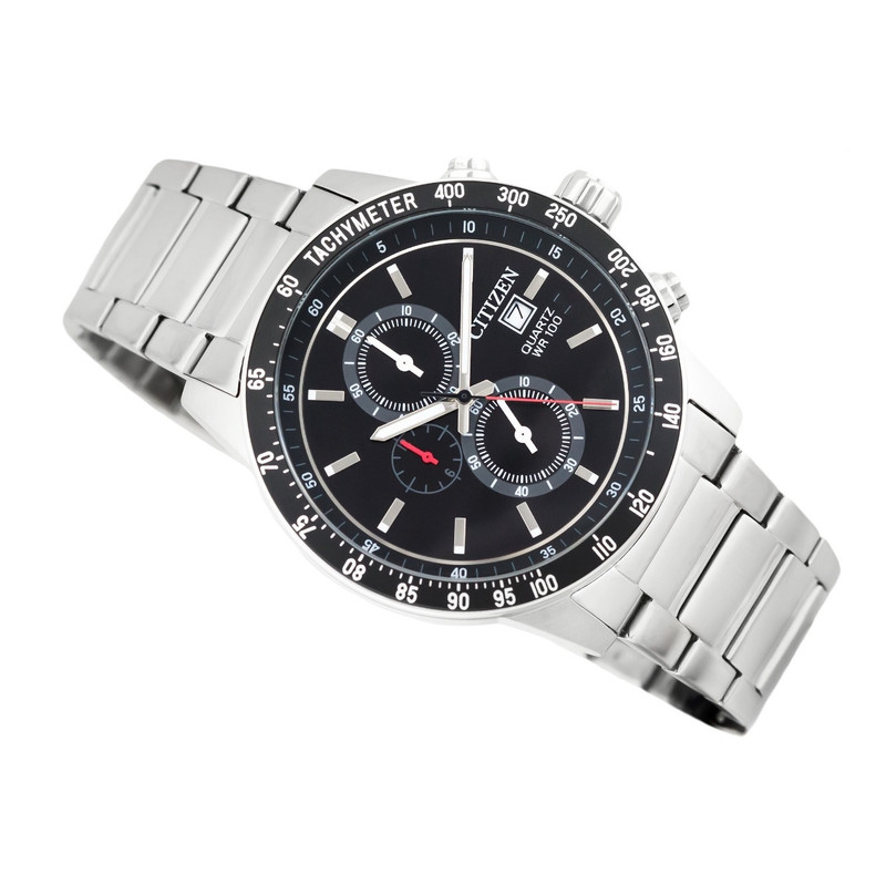 این مدل از ساعت مچی های برند سیتیزن دارای بند و بدنه استیل با ترکیب دو رنگ مشکی و نقره ای بوده و با صفحه مشکی خود صاحب ابهت و جذابیت بی نظیری شده است. این ساعت برند سیتیزن کرنوگراف بوده و عقربه های کوچک آن کرنومتر هستند و همچنین دارای نمایشگر روزهای ماه نیز می باشد. این طرح از ساعت های سیتیزن جزو پرفروش ترین ساعت های ژاپنی دنیا به شمار می رود. اعداد دور صفحه ی این طرح از ساعت سیتیزن تاچیمتر هستند و سرعت و شتاب را در فاصله ی یک کیلومتری نمایش میدهند.