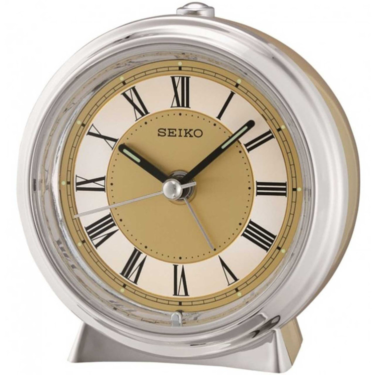 اگر برای اتاقخوابتان دنبال یک ساعت رومیزی باکیفیت و خوشساخت با طراحی مدرن هستید، ساعت «Seiko» (سیکو) مدل «QHE132» گزینهای ایدئال است. این ساعت دایرهای شکل طولی بهاندازهی 10.3 سانتیمتر دارد و به فضای زیادی را اشغال نخواهد کرد؛ بنابراین با خیالی آسوده میتوانید آن را روی میز کنار تخت یا حتی کانتر آشپزخانه قرار دهید تا بهراحتی گذشت زمان را مشاهده کنید. یکی از پیچهای تنظیم این مدل برای ثابت ماندن روی یک ساعت خاص طراحی شده است؛ بنابراین با تنظیم عقربه روی زمانی خاص، در ساعت مقرر آلارم به صدا درمیآید. عقربههای اصلی مدل «QHE132» شب نما هستند تا در تاریکی شب نیز زمان را بهخوبی مشاهده کنید. ناگفته نماند که با فشار دادن یکی از دکمههای تعبیه شده در ساعت میتوان بدون نیاز به روشن کردن چراغهای اتاق، صفحه را بهطور کامل روشن و قابلمشاهده کرد. نمایش اعداد بهصورت رومی روی صفحهی طلاییرنگ ساعت، جذابیت و زیبایی آن را چندین برابر کرده است. از دیگر قابلیتهای این مدل میتوان به بیصدا بدون ثانیهشمار اشاره کرد؛ بنابراین عقربهها بدون ایجاد صدای اضافه حرکت خواهند کرد تا با خیالی آسوده ساعت را در اتاقخواب و کنار تخت استفاده کنید.